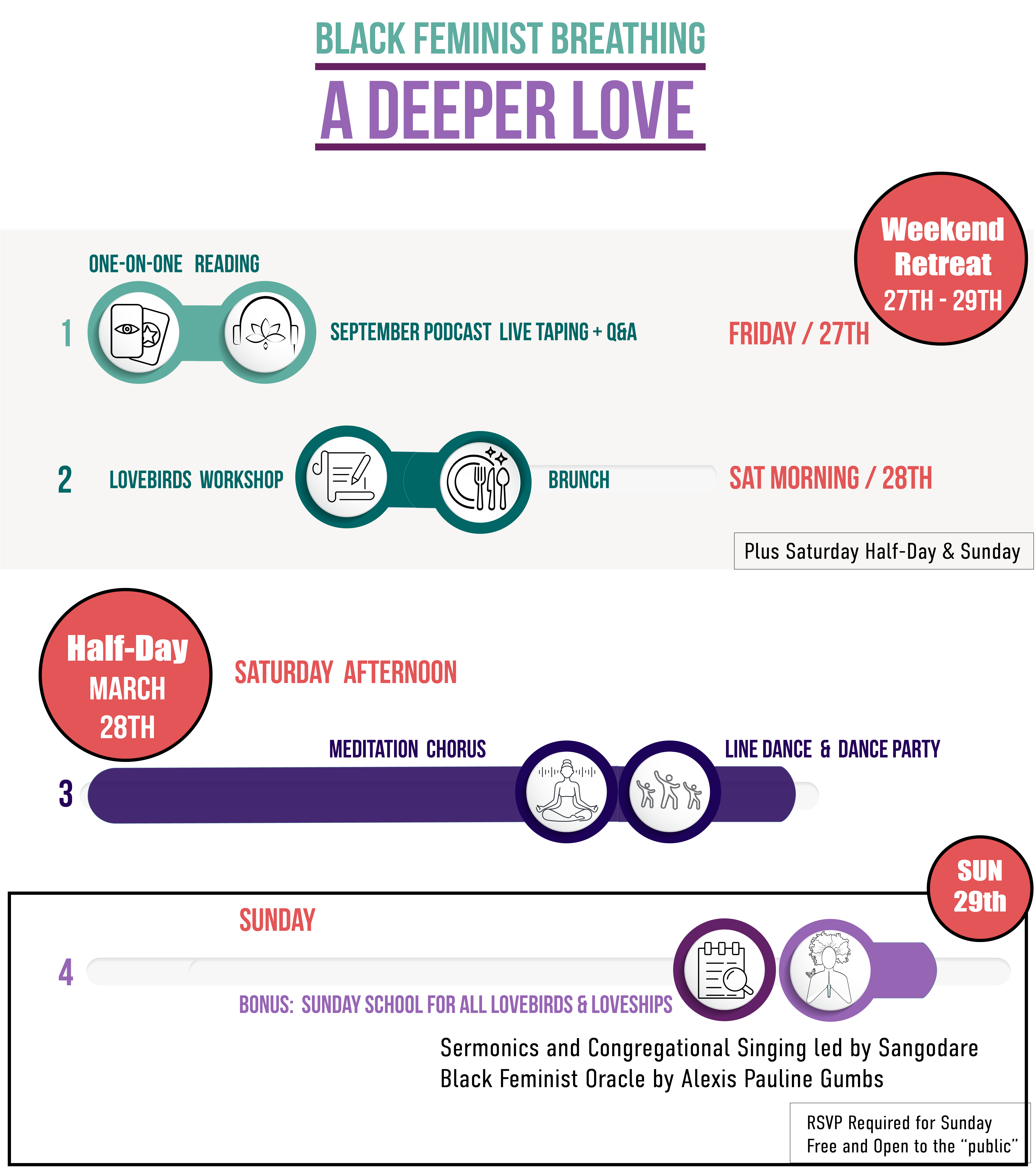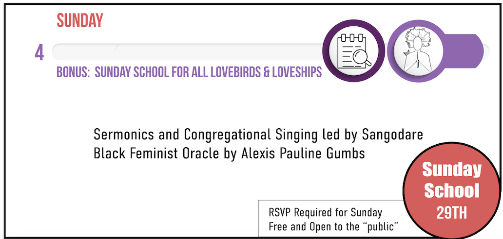 BONUS: This gathering is a free bonus for the lovebird participants, their guests and all our Loveships community. We will host a Black feminist Sunday Service that we call "Sunday School". This will take place on Sunday afternoon in Durham as well.